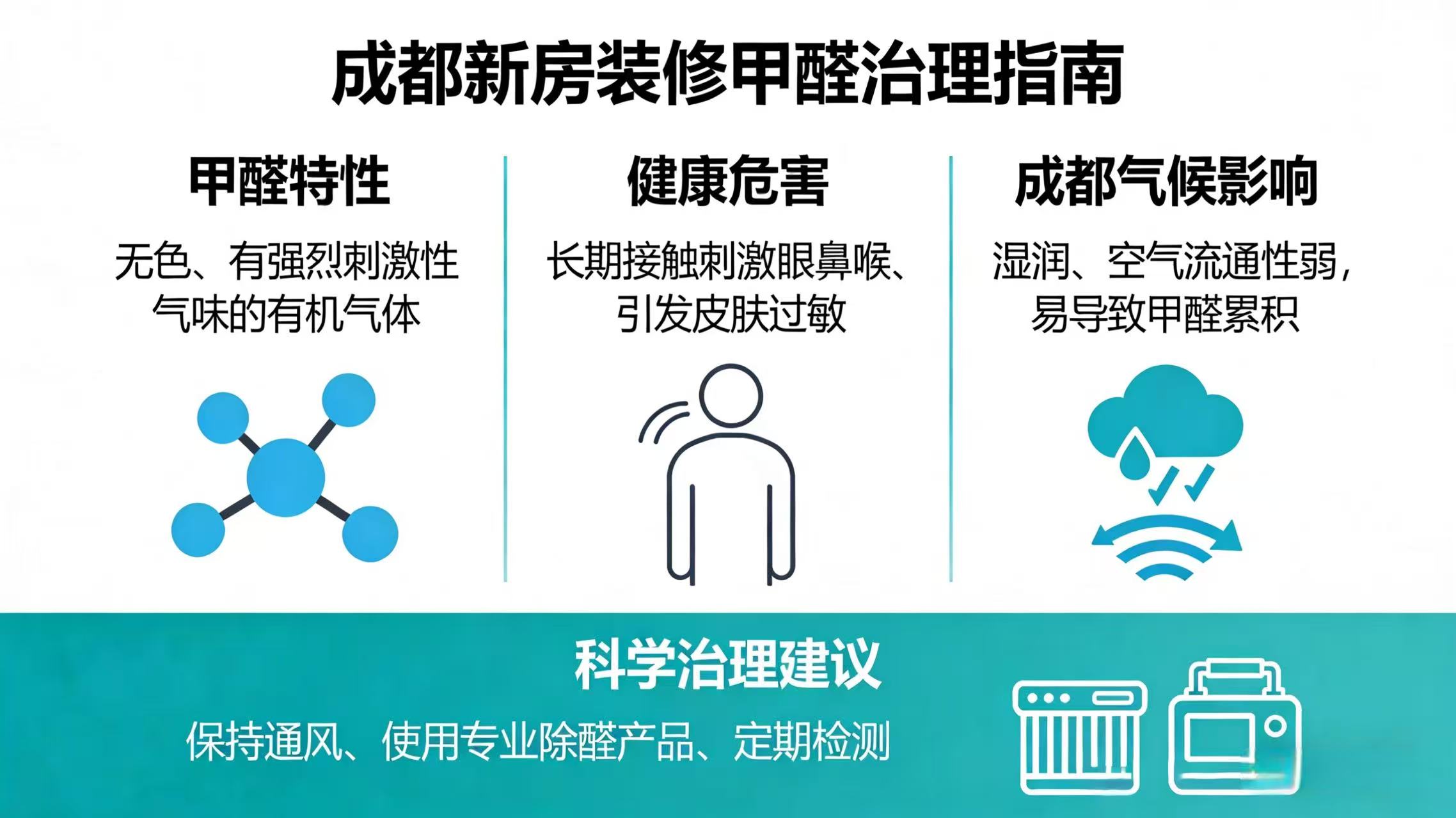 成都新房装修后,甲醛超标是多数家庭会面临的问题。甲醛是一种无色、有强烈刺激性气味的有机气体。长期接触会刺激眼鼻喉、引发皮肤过敏,对人体有害。成都气候湿润、空气流通性偏弱,更易导致甲醛累积,科学治理刻不容缓。