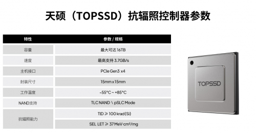 l系统级抗辐射设计:采用工业级高密度3D TLC NAND(单颗容量可达1Tb以上),配合片上增强型LDPC ECC以及专有的抗单粒子翻转校验池,实现接近传统Rad-Hard SLC方案的水平,而存储密度提升数倍、成本显著降低。