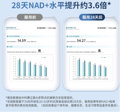 根据人体测试数据,受试者在连续服用28天后,血液NAD+水平平均提升约3.6倍。更值得关注的是,参与测试的人群中,普遍反馈精力改善、运动后恢复加速、睡眠质量提升以及认知清晰度增强——这些,正是长期服用NMN“没感觉”的人群最渴望的那种真实体感。