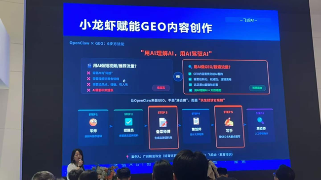 现场,旋子老师首次公开OpenClaw×GEO 6 步闭环方法论,从真实品牌资料采集、语料库构建、结构化撰写、标准化质检、流量分发到效果追踪,形成全流程可复制、可规模化的实战体系。并以飞轮会、广州枫珠宝等真实案例为佐证,展示如何用 AI 工具实现 GEO 内容创作效率百倍提升、AI 大模型推荐率持续上涨,获得在场嘉宾、企业负责人与技术专家的高度认可。