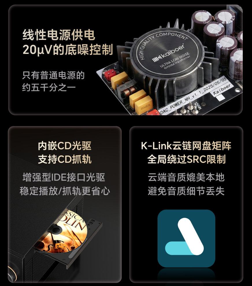 此外,HiFi玩家关心的专业HiFi数播应该有的“元素”,如:专业线性电源、支持固态硬盘(M.2及2.5英寸sata)、移动端APP全局遥控器、AppleMusic/QQ音乐/网易云专属api接入,甚至内嵌CD机等,开博尔DMP-K8均一应俱全。