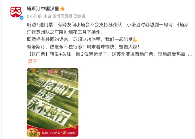 一位苏州本地网友的话道出了很多人的心声:“这次合作真的太喜闻乐见了。因为网友的参与而促成,顺应人心,既体现了塔斯汀的开放姿态,也让我们看到了苏超的魅力。”