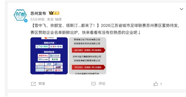 当网友的玩梗变成现实,苏超第二季迎来了最有参与感的名场面。4月8日,塔斯汀中国汉堡在官微正式官宣赞助苏州赛区,一句“热爱永不独行”,为这场始于logo撞脸的双向奔赴画上了圆满的句号。与此同时,苏州方面也公布了2026赛季的合作伙伴名单,塔斯汀赫然在列,成为本赛季颇受瞩目的赞助商之一。