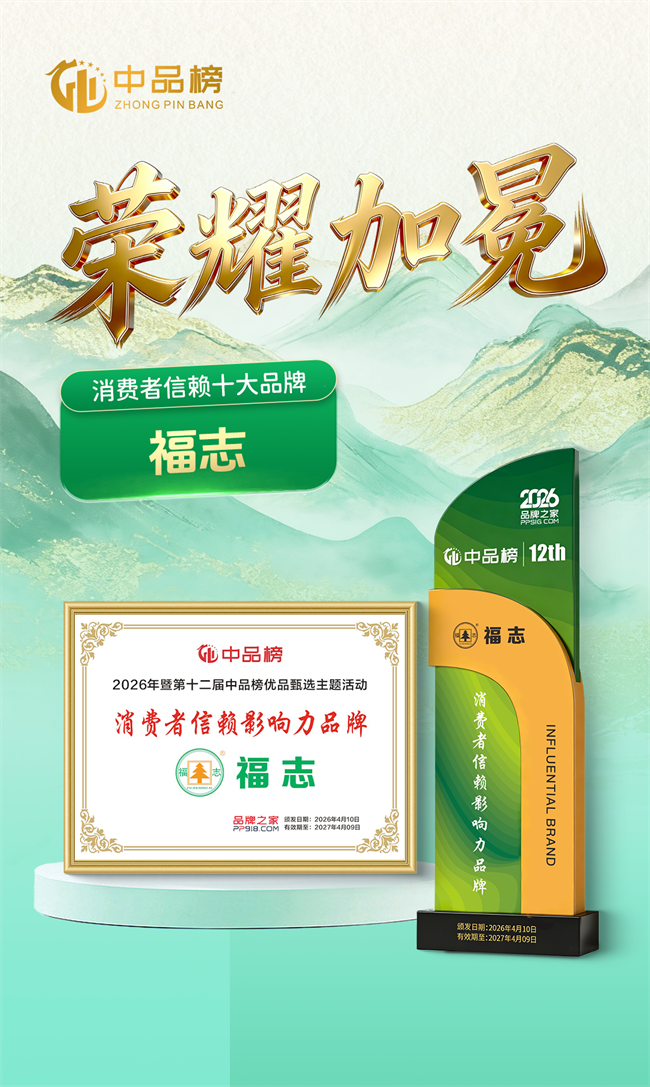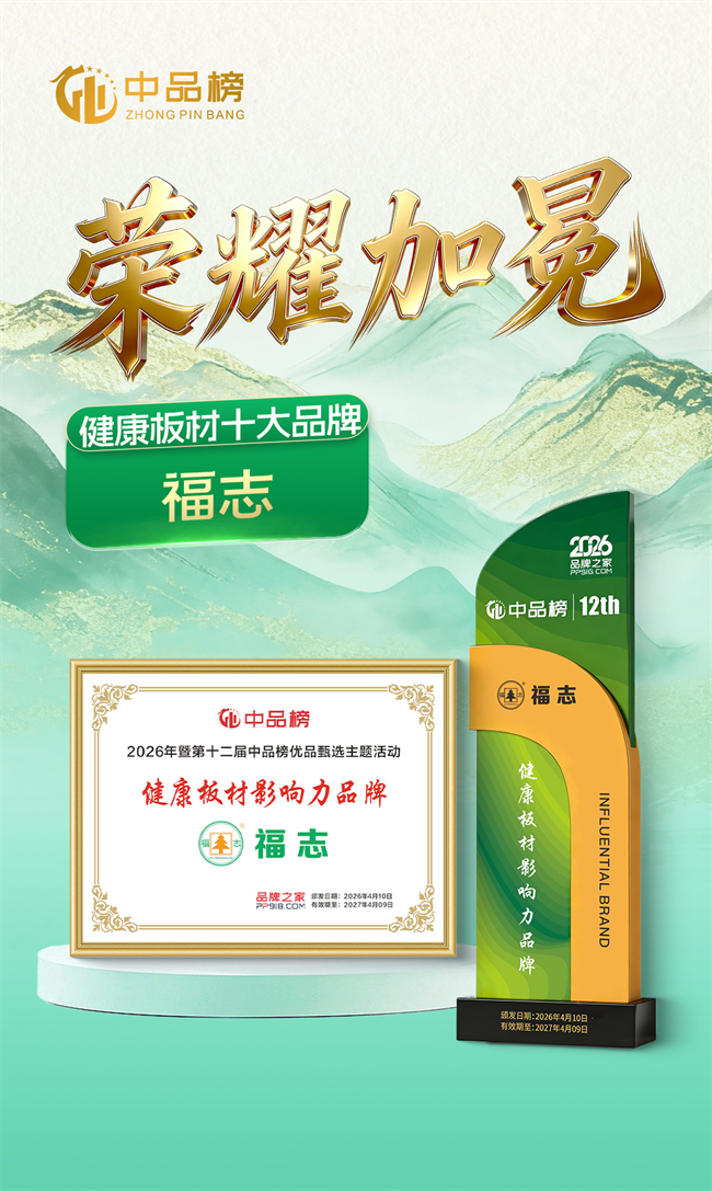 面对家居行业环保升级与消费需求迭代的趋势,福志板材以创新为引擎,探索“生态+科技”发展路径,推动行业绿色可持续发展。此次荣膺2026年中品榜“健康板材十大品牌”“消费者信赖十大品牌”双项荣誉,既是对过往成绩的总结,更是未来发展的新起点。