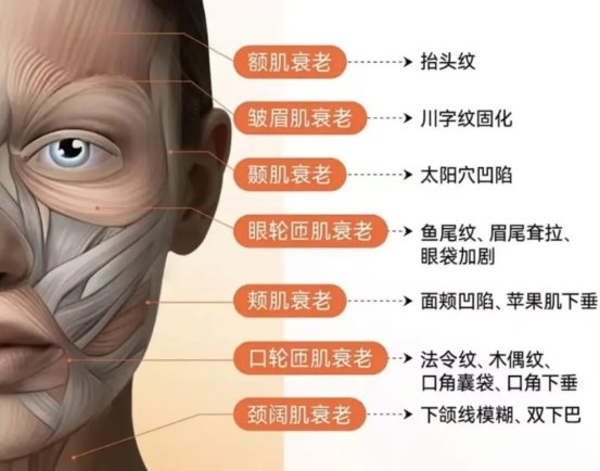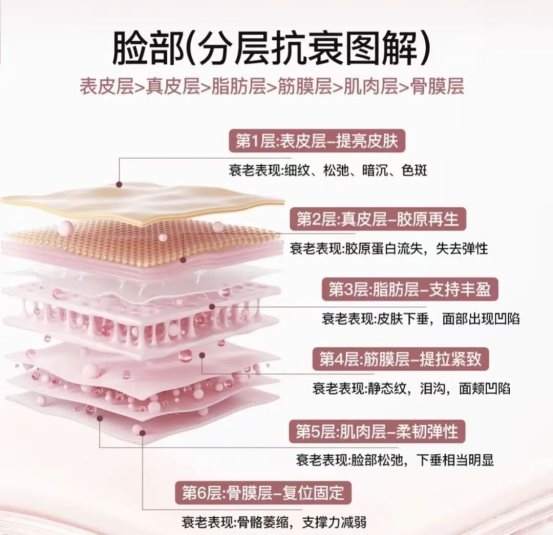 面部衰老与抗衰,通常涉及多个层次,由浅至深主要包括:表皮 -真皮 -皮下脂肪 -肌肉层 -SMAS筋膜层 -韧带 -骨膜-骨。
