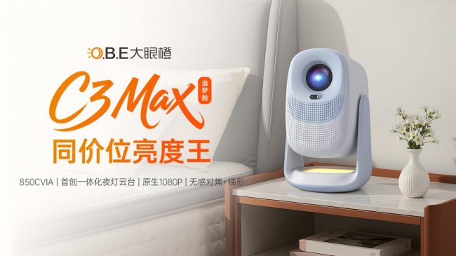 全新发布的大眼橙C3 Max投影仪,专为高品质卧室观影量身打造,集投影、音响、夜灯三功能于一体。产品采用天青蓝清新外观,体积小巧,摆放灵活不占空间。产品实现850CVIA实测高亮度、原生1080P分辨率,配备无感自动对焦与梯形校正、智能避障等智能功能,打造千元投影体验标杆。搭载一体化夜灯云台,支持360°水平旋转与120°俯仰调节,灵活适配卧室多场景投射;运行风噪低于26dB,结合赛西低视觉疲劳护眼认证与流畅智能操作系统,重构卧室观影的质感边界。首发到手价仅需1299元。
