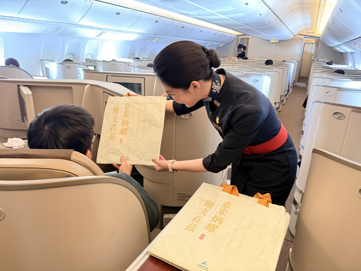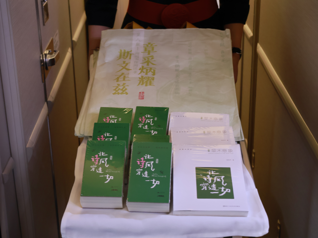 航班上,来自东航“凌燕”青年志愿服务队的乘务员们,向旅客介绍上海图书馆出版的新书《草木意象:让“诗”风穿透一切》,从《诗经》里的古老韵律,到天府成都的温润诗意,将古典诗词中的深远意趣与动人故事娓娓道来。活动还设置了互动游戏环节,乘务组邀请旅客在趣味问答中共读经典诗句,了解《诗经》典故。更有幸运旅客获赠了新书《让“诗”风穿透一切》、mini诗集、主题卡片等特色纪念品。