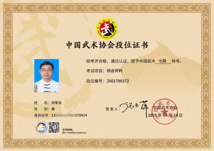 刘君合(原名刘军合)因教学耐心儒雅,受学生建议更名为“君合”,后获评“中国武术七段”称号
