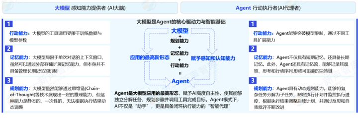 AI Agent是“数字人“,大模型是”数字人的大脑“。大模型是AI Agent的核心驱动力与智能基础,它为Agent提供了关键的感知与认知能力,包括理解信息、进行知识推理、生成文本以及展现创造性思维,如同赋予Agent一个强大的“大脑”。AI Agent是在大模型的基础上整合了三大关键能力组件构成的更高级架构:规划(Planning)、记忆(Memory)和工具使用(Tool Use)。这种结合了大模型智能与行动能力的架构,代表了当前大模型应用的最高阶形态,实现了从被动响应到主动规划和执行的跃迁。