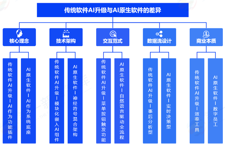 传统软件AI升级如同“燃油车改电动车”,在旧架构上局部优化,受制于历史包袱陷入“功能触发式”数据调用的效能瓶颈;而AI原生软件则像是“造特斯拉”,以“需求预判式”数据融合为核心,推动软件从被动工具蜕变为主动业务引擎。二者在核心理念、技术架构、交互范式、数据流设计、商业本质上存在代际差异。以客服系统为例:前者仅能延迟响应单一问题,后者则实时预判需求并拦截风险——这昭示着软件价值已从“提升旧世界效率”转向“定义新世界规则”。