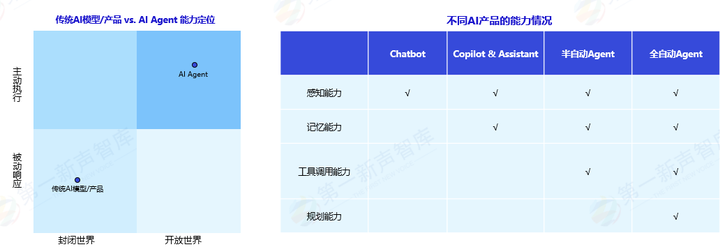 大多数AI产品(如文本生成、图像生成模型)是被动响应的“大脑”,是具备 “理解与生成” 能力的技术底座,仅能完成文本创作、信息问答等单一、封闭的输出任务,它们接受输入并产生输出,但无法影响外部世界。而AI Agent则同时具备 “感知能力、记忆能力、工具调用能力、规划能力”四大能力,其核心差异在于是否具备工具调用(Tool Use)能力,即主动调用外部工具以拓展能力边界、达成复杂目标的能力。关键差异在于Agent实现了从“解答问题”到“解决问题”的跨越。