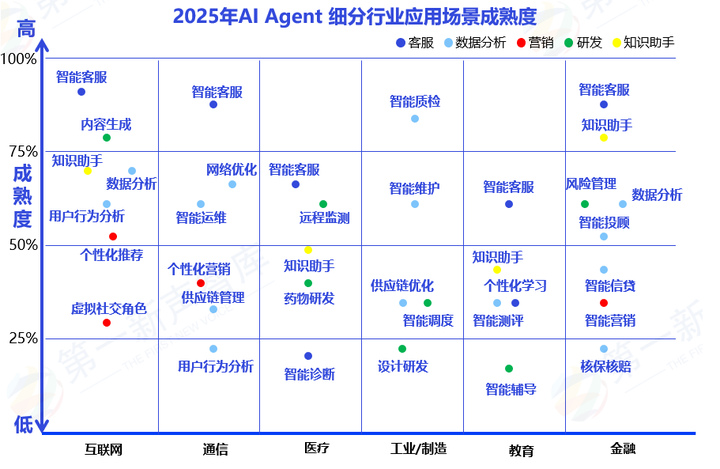 在行业应用层面,AI Agent的价值释放与行业数字化基础、数据成熟度高度相关。AI Agent正在多个关键领域实现从“辅助工具”到“核心驱动”的角色转变。根据第一新声智库研究,AI Agent已走出试验阶段,其应用深度与行业数字化基础高度相关,并在金融、通信等数据密集型行业中率先形成规模价值。
