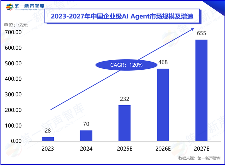根据第一新声智库研究,2023-2027年中国企业级AI Agent市场规模复合增长率将达到120%,至2027年,企业级AI Agent市场规模将达到655亿元。
