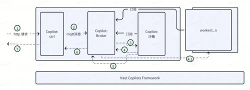 NJet在做动态化能力设计时,曾利用了基于MQTT消息的event框架,整体实现为利用CoPilot框架实现了一个消息的broker,同时CoPilot ctrl进程作为API Server,接收HTTP请求,转化为消息后,发送给沙箱进程做配置验证,验证后,广播给作为消费者的所有的worker进程应用配置变更。