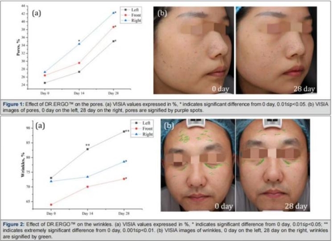 临床数据显示,连续使用8周后,受试者肤色透亮度提升至202.9%,皮肤弹性提升至252.6%;每日口服25mg麦角硫因仅4周后,毛孔改善率达54.84%,皱纹减淡达21.61%,褐斑亦有明显淡化。