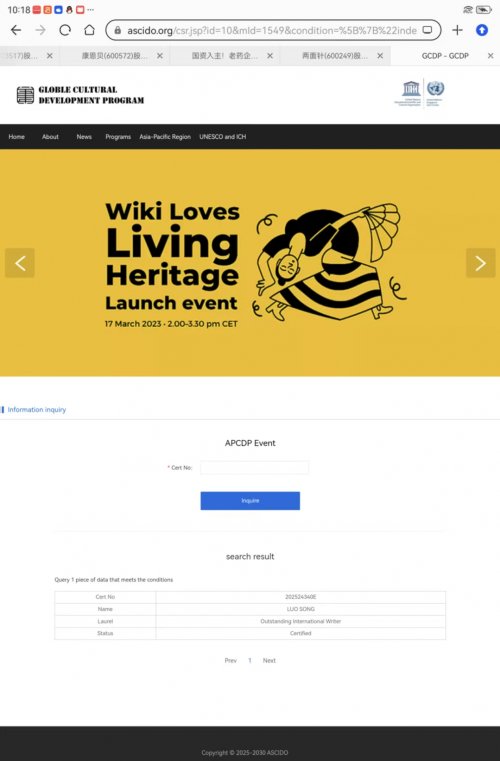 联合国教科文组织是知识领域最具权威性的一个政府间国际组织,成立于1946年,总部设在法国巴黎,有194个成员和12个准成员,是各国政府间讨论关于教育、科学和文化问题的国际组织,旨在通过教育、科学和文化促进各国合作,对世界和平和安全作出贡献。截止到发稿前,已经在联合国全球文化发展计划官网https://www.ascido.org可以查询到罗松的“杰出国际作家”证书信息。