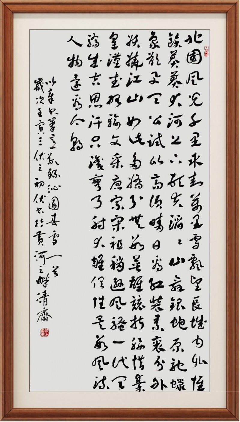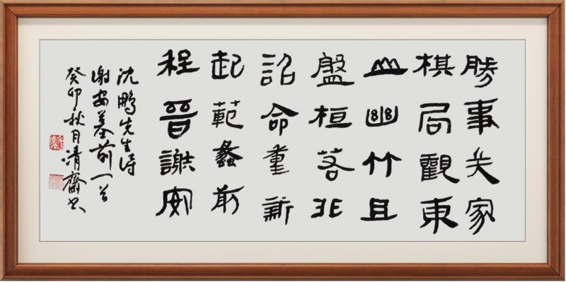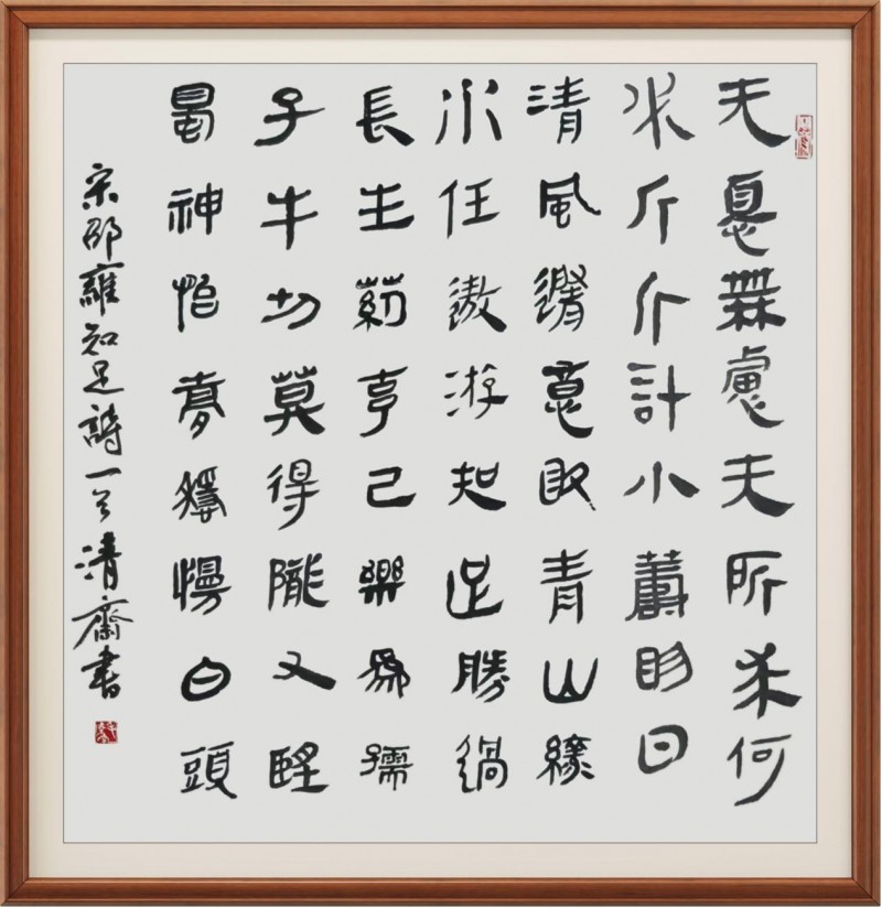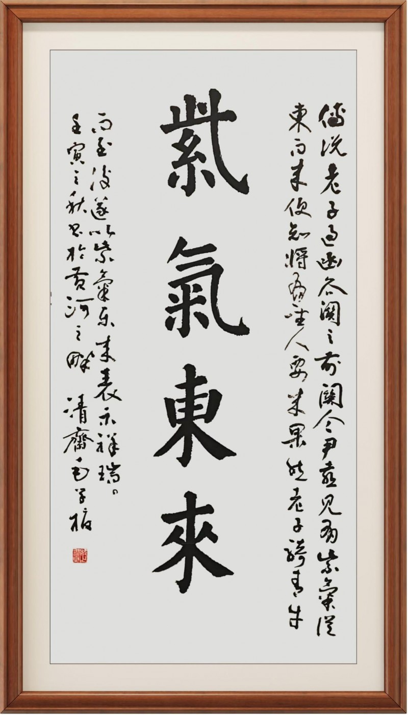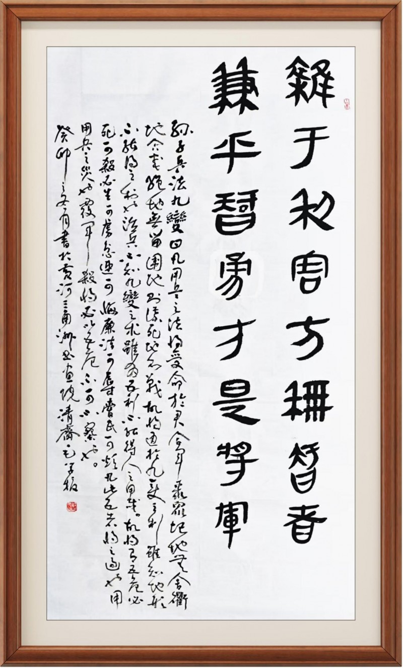 于楷法作品中,毛学校先生则又是能深得碑学文化的涵养积淀,像颜筋柳骨、礼器、始平公造像记等等诸碑,可谓皆是能从其作中循以其势!所以对观赏者来说,欣赏毛学校先生的楷法书作,也是并不会感受独一家亦或是某家某碑的复刻之意,取而代之的,则是一种能够充分糅合诸家碑法的书风体现,正如清人梁谳于《学书论》一书中所言,是谓继采诸美,变动弗拘。斯为不掩性情,自辟门经!书中楷体,笔墨饱满以至线条厚实,时如硬刀刻石般尽显刚健,时如壮士拔剑般体象卓然,转折方勒气势浑穆,结体取势血肉丰美,由此诚是有将整幅楷法书于雄峻也!作于匾额,自然可见浩然之正气,书于竖幅,更是可见工整之严谨,一点成一字之规,一字乃终篇之准,楷法无欺,有目共睹!