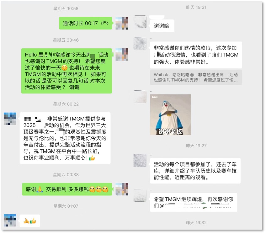 TMGM 始终致力于为尊贵客户打造稀缺体验场景。本次赛事中,通过整合全球资源网络,TMGM的朋友们不仅在黄金视角见证了冠军车队的夺冠时刻,更体验到全方位的尊荣:顶级团队定制的中西美食与精选佳酿,车手互动环节中的深度交流,以及乘坐安全车巡游赛道的极致体验,获得 "0 距离" 的速度记忆。还为来宾搭建高端人脉平台,为促成跨界合作意向创造可能,得到交易之外的尊荣礼遇。这种从观赛到互动的一站式服务,正是 TMGM"以客户为中心" 理念的具象化呈现。