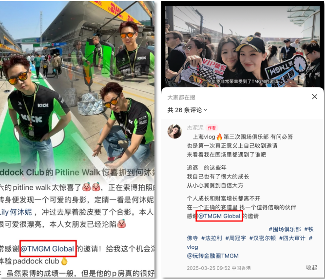 TMGM 这场聚会的稀缺体验迅速转化为社交货币,受邀来宾在社交平台晒出的内容引发热议。从米其林星厨现场烹制的鎏金餐盘特写,到与车手并肩的亲密合影;从车队备战区的机械美学抓拍,到穿越赛道的第一视角 vlog,每帧画面都成为身份与品味的象征。