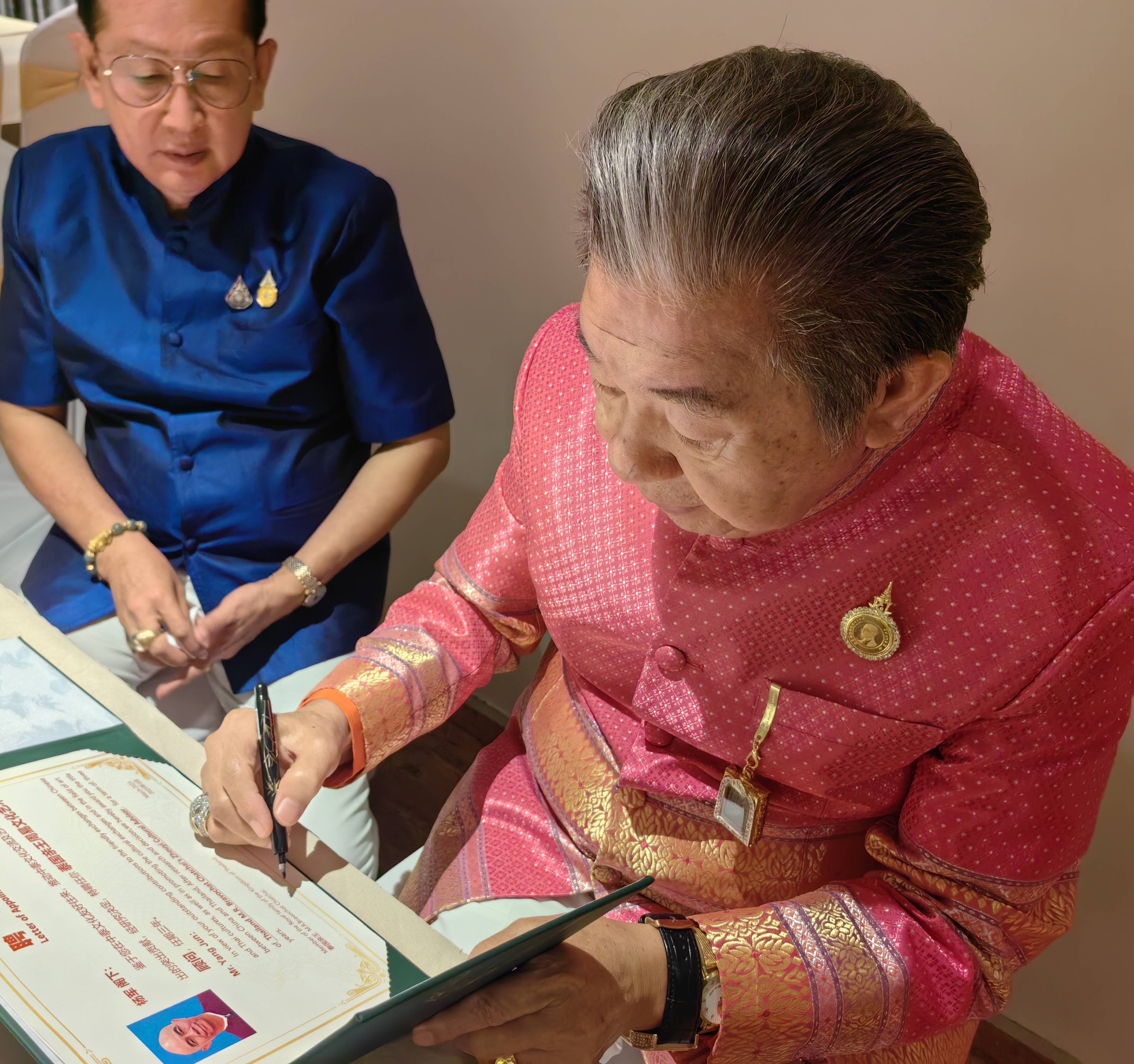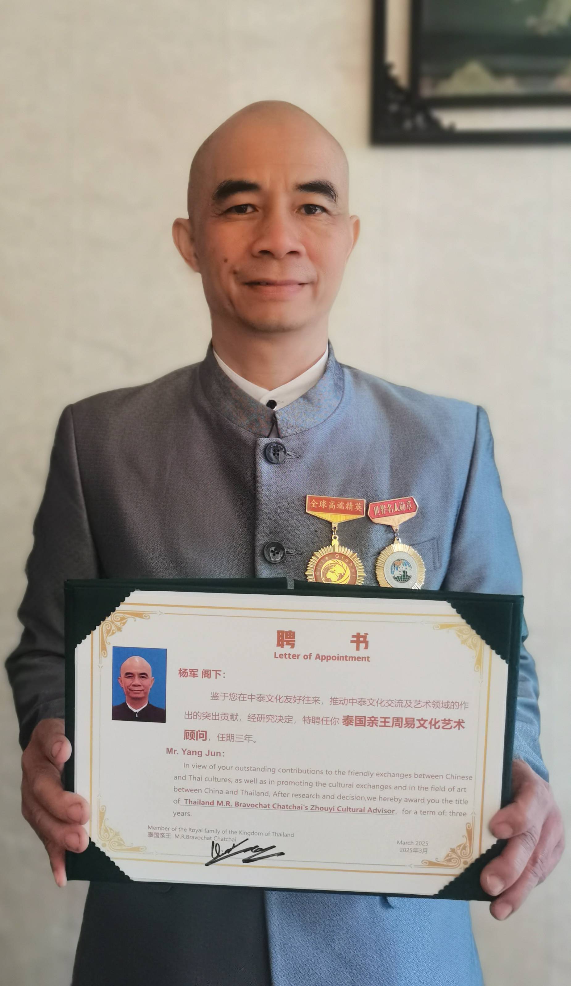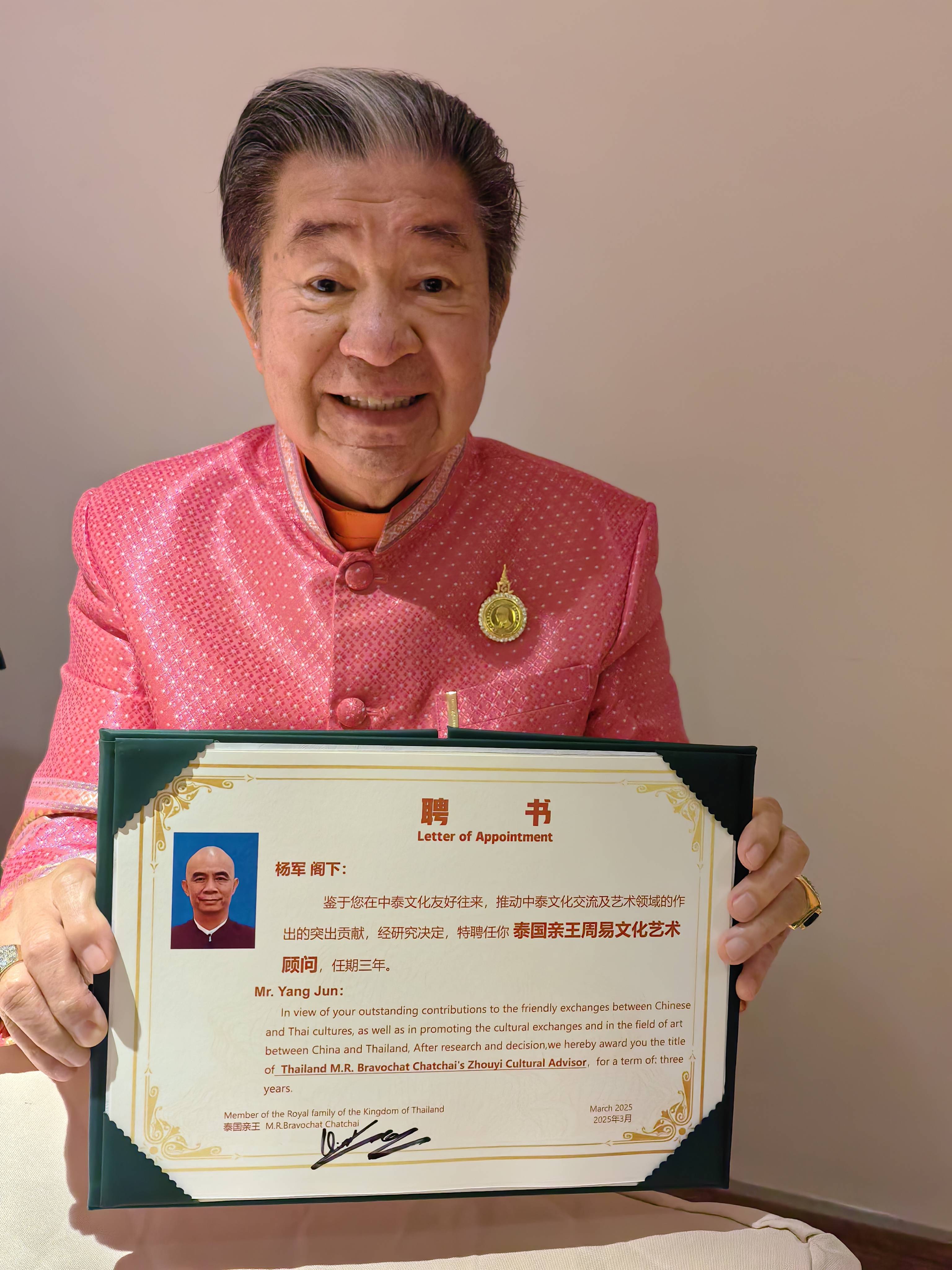 2025年泰中迎来建交50周年,是泰中友好关系中具有里程碑意义的一年。值此举世同庆泰中50载深厚友谊的重要契机,泰国查猜亲王在贝恩博士的见证下亲自为杨军先生签发了《泰国亲王周易文化艺术顾问》证书。