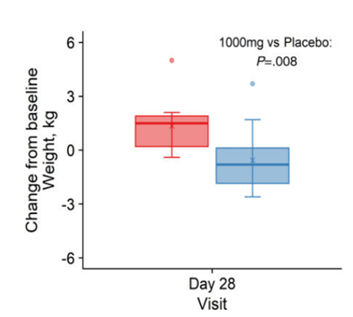 ( Pencina 等人,2023 | J. Clin。内分泌 . ) NMN 减轻体重。 与接受安慰剂(红色)的参与者相比,补充NMN(蓝色)的参与者体重减少了约3公斤。