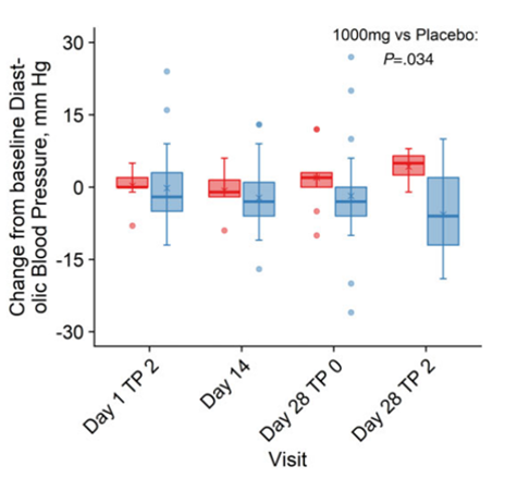 ( Pencina 等人,2023 | J. Clin。内分泌 . ) NMN 降低血压。 与安慰剂(红色)相比, NMN 治疗(蓝色)在补充后的第 28 天(第 28 天 TP 2)降低舒张压约两个小时。