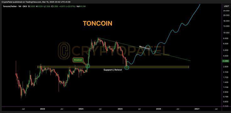 3月19日最新数据显示,Toncoin(TON)价格从一年低点2.35美元强势反弹至3.20美元,单周涨幅达36%。加密货币分析师Crypto Patel指出,此次反弹的关键在于2.40-3.00美元区间的历史支撑位。该区间曾在2022年末至2023年初多次验证为阻力位,如今转化为支撑,形成“多空转换”的技术信号。此外,TON的周线级别下降楔形形态已接近突破边缘,若成功站上3.50美元,则可能触发算法交易模型的买入指令,推动价格向5-6美元目标区间跃进。
