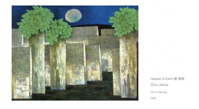 “浮沉大地,月光笼罩层叠老屋,期间绿叶,如忽明忽灭的希望;善恶交替,生命的历程周而复始,静谧的气韵蕴藏万千气象。”这即是周加华终其一生不断重复的绘画意向。从绘画表达到空间艺术,他的作品像一个容器,收藏一个片刻的思绪,一个时代的愿力;他的笔触永远都在关注变动不居,永不停息的客观世界,一切辉煌的寂寥的,也许苦楚,却总有希望。