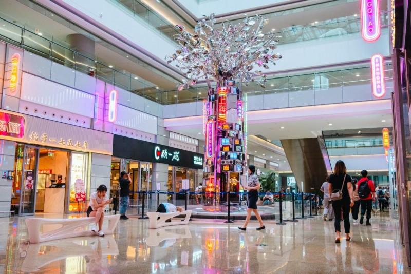 57台老式显像管电视机组成的树体足有三层楼高,配合通体霓虹,仿佛穿越时空的光电交织——距今三十年前的纪事画卷徐徐展开:1988,汉城奥运会开幕式上,圣火熊熊燃烧;外滩沿岸,联谊大厦刚刚拔地而起;上海歌手毛阿敏身着金色蝙蝠衫参加央视春晚......偌大的挑高空间,偶有不⻅神色的匆匆过客驻足抬眼,似乎还能透过每片金属冶制的树叶,再次窥视到时代的斑驳光影。