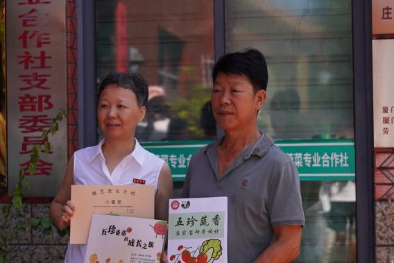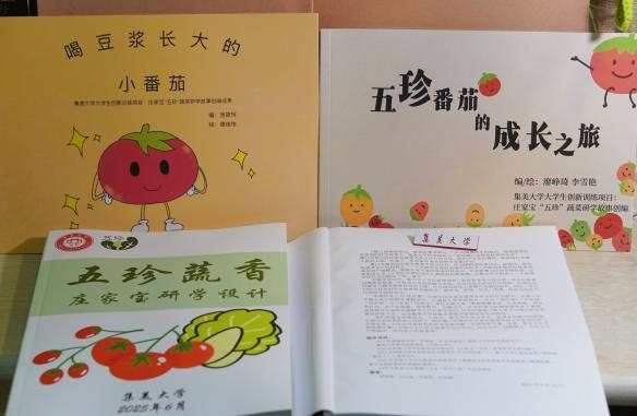 实践队携着一份由集大学子精心创制的礼物,踏上了前往庄家宝蔬菜专业合作社的旅程。研学手册《五珍蔬香——庄家宝研学设计》,收录了63份研学课程设计,将田间地头的实践经验转化为可操作的研学方案;绘本《喝豆浆长大的小番茄》与《五珍番茄的成长之旅》以活泼的卡通画、童趣的语言,讲述庄家宝特色名片。这份特别的礼物凝聚了集大学子的赤忱匠心,更是校企两方共鸣共振的鲜活成果。