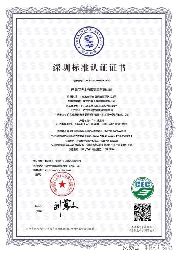 近日,中高端学习桌品牌博士有成接连传来喜讯,旗下产品凭借卓越品质斩获多项权威认证,引发行业广泛关注。其中,钢木家具、钢塑家具两大核心品类历经严苛审核,成功摘得中国绿色产品认证证书(证书编号:ZRC25P550142R0S 、ZRC25P550141R0S);与此同时,午休课桌椅通过深圳标准先进性评价,斩获深圳标准认证证书(证书编号:CEC2025CVP0809 000 50)。多项权威认证的叠加,不仅是对博士有成产品品质的硬核肯定,更是品牌坚守初心、专注儿童健康学习的有力见证。