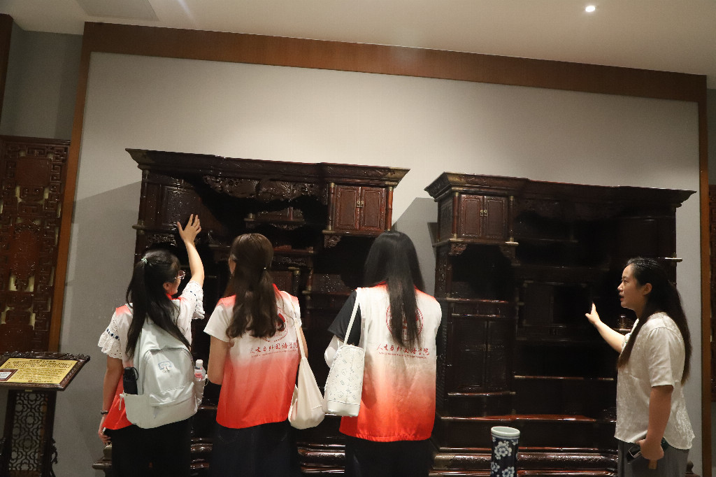 匠心雕琢,红木技艺从馆藏走向生活。在红木非遗传承基地,队员们重点考察了淄博红木雕刻的精湛技艺。从选料、设计到雕刻、打磨,每一件红木制品都凝聚着工匠的智慧与心血。其中的檀香阴沉木《三十三观音》凭借其珍贵的用材以及雕刻任务最多的阴沉木作品这一成就,获得世界吉尼斯纪录认证。据介绍,当地通过“大师工作室+培训基地+文创产品”模式,在坚守传统榫卯、浮雕镂空等核心技艺的同时,巧妙融入现代审美,并开放实操体验,成功推动红木非遗从“收藏馆”走向“生活场”,为实践队提供了宝贵的活化传承思路。