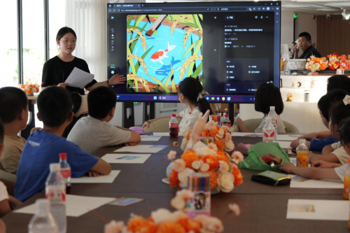 图 实践队员卢田琳在稻鱼共生博物馆主讲AI美育课堂