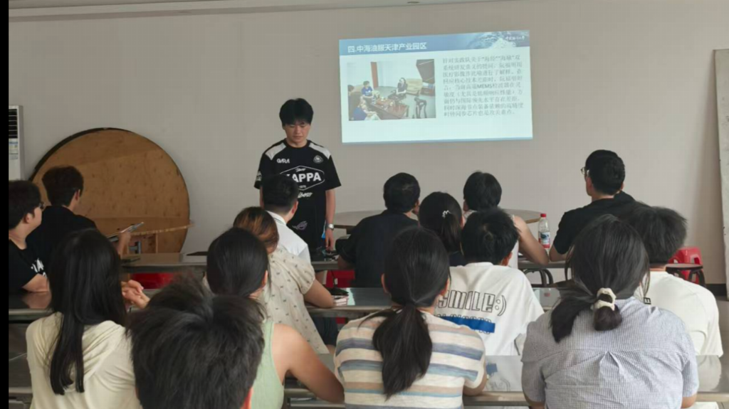 调研结束后,实践队返回校园,面向各专业同学举办多场宣讲会。通过精心制作的PPT与生动讲解,队员们系统分享调研见闻与感悟,既介绍了国产“海经”“海脉”系统、海洋可控源电磁勘探设备、地震检波器等装备的技术突破,也坦诚交流了高端MEMS检波器、高精度时钟同步芯片、ADC采集芯片及特种弹簧材料等领域仍存在的技术差距。