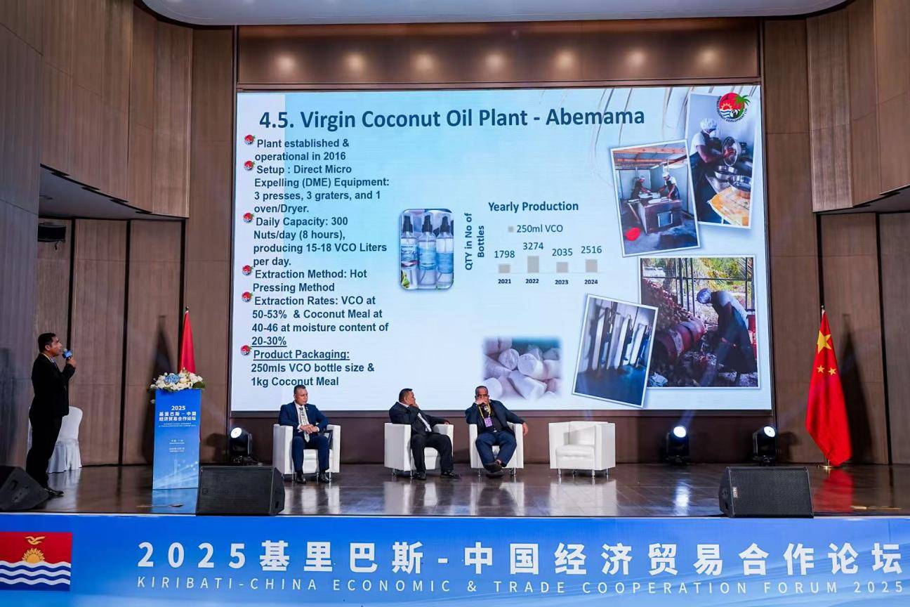 基里巴斯椰子开发有限公司代理首席执行官伊廷纳巴·蒂蒙先生介绍了当地优质椰子资源及加工产品,包括椰子油、椰奶、椰干等,欢迎中国企业参与产品研发、品牌打造及国际市场开拓,助力基里巴斯特色产业升级。