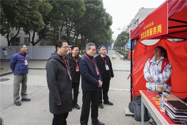 考试期间,江苏理工学院党委书记崔景贵,校党委副书记、校长戴国洪,党委常委、副校长王俊,当地公安、无线电以及学校相关等职能部门负责人深入考点一线,先后察看安检门情况,详细询问工作人员安检流程、违禁物品处置等细节;在视频监控室,系统细致察看各考场实时动态与纪律执行情况,并亲切慰问坚守在一线的工作人员与志愿者。校领导强调要持续筑牢标准化考场硬件设施与技术保障屏障,以全过程精准化监督护航考试公平公正,以研考组织实践为抓手,进一步助推学校教育信息化建设提质增效,为教育教学高质量发展赋能。