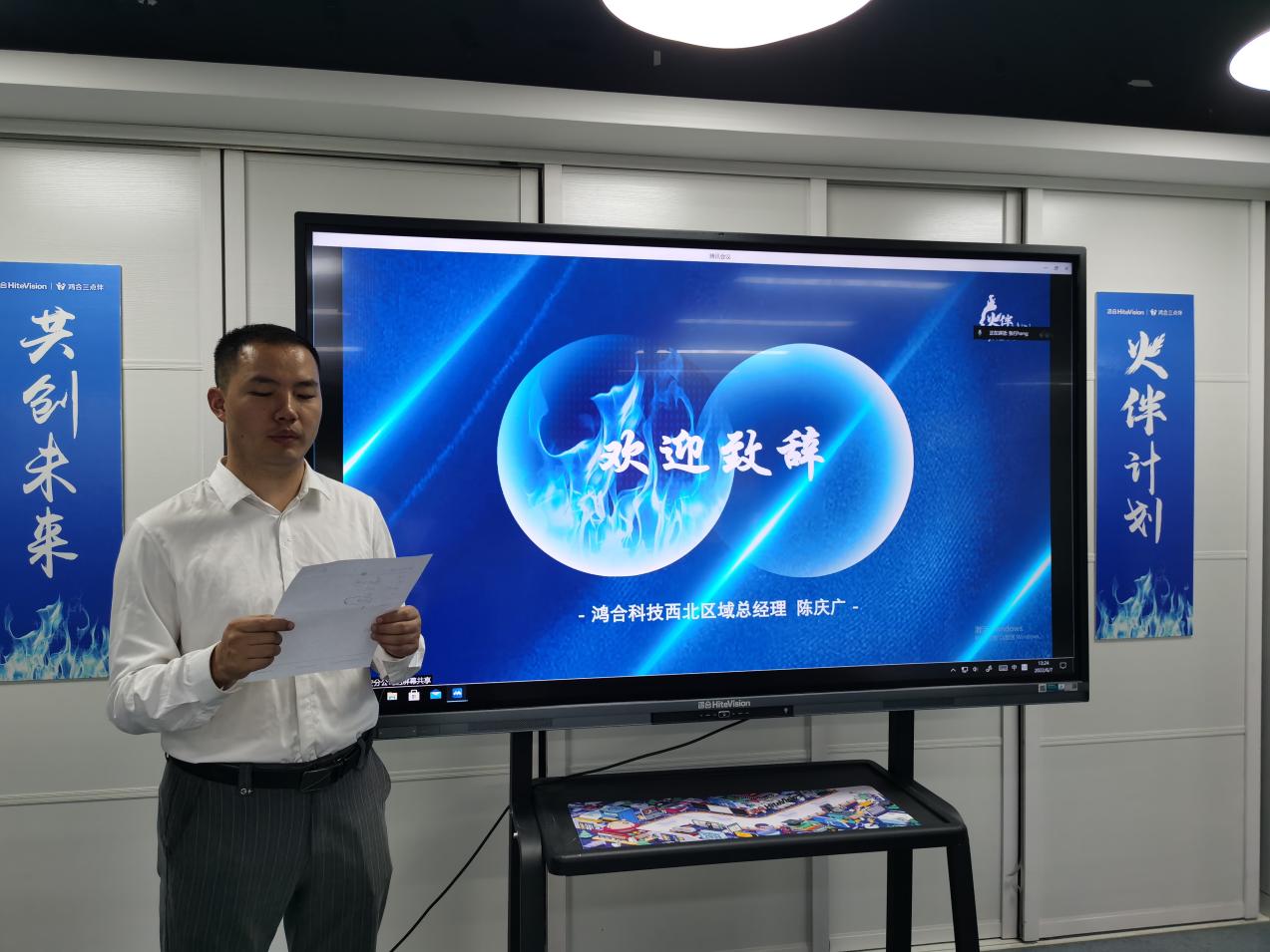 首先,鸿合科技西北区域总经理陈庆广先生致欢迎辞,向线上下的参会同仁表达诚挚感谢。他指出,鸿合科技扎根陕西二十余年,发展成绩亮眼,稳中有进,呼吁嘉宾们加入“火伴计划”,让“鸿合三点伴”为陕西课后服务和义务教育发展添砖加瓦,获得更大发展。
