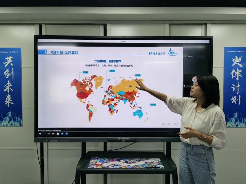 欢迎仪式后,鸿合科技西安区域售前主管曹韡娜女士带来鸿合科技的企业简要介绍,她分享了鸿合科技30多年来在教育信息化中的业务探索和行业引领,重点介绍“鸿合三点伴”作为“一核两翼”战略规划中一“翼”,背靠上市公司核心实力,占据业务落地时间的优势。依托此方案,一定能为合作“火”伴们提供事业拓展思路,期待大家信赖鸿合、携手鸿合。