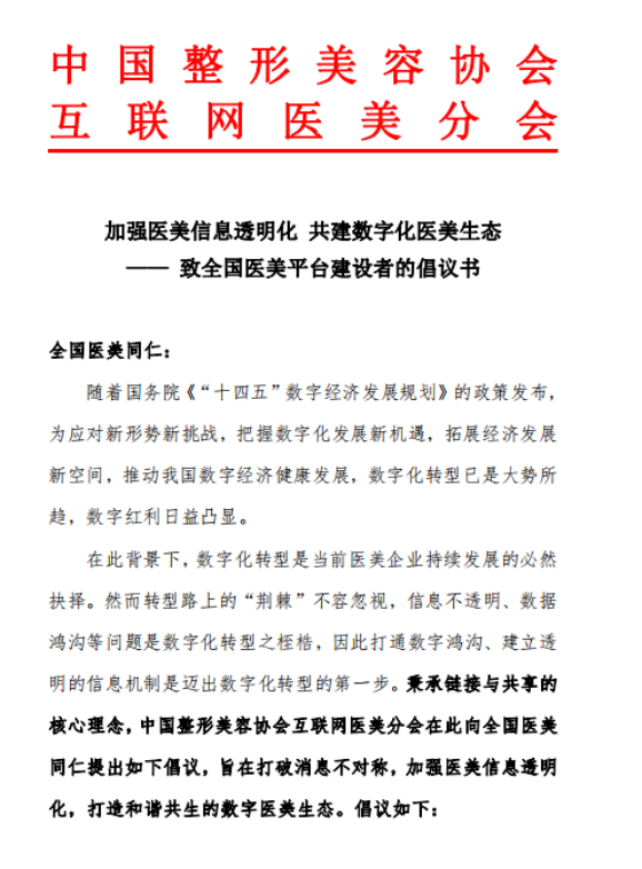 这些痛点不仅阻碍着医美行业的生态建设,同时也影响着求美者是否进行医美消费的决策。为了促进行业的健康发展,7月12日,中国整形美容协会互联网医美分会(以下简称中整协互联网医美分会)正式发布了《加强医美信息透明化,建数字化医美生态》,倡导全行业加强医美信息透明化,通过数字化建设,让更多消费者能够享受到好医生、好机构、好产品、好服务。