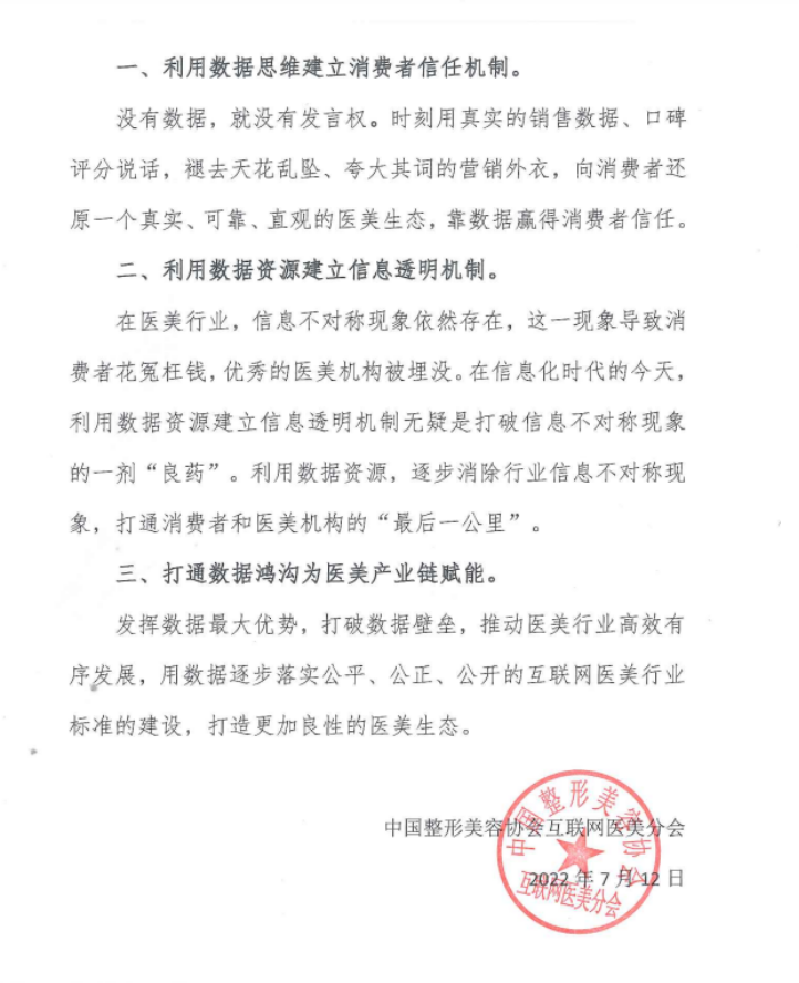 倡议书指出,在医美行业,信息不对称现象依然存在,这一现象导致消费者花冤枉钱,优秀的医美机构被埋没。在信息化时代的今天,利用数据资源建立信息透明机制,无疑是打破信息不对称现象的一剂“良药”。利用数据资源,逐步消除行业信息不对称现象,打通消费者和医美机构的“最后一公里”。