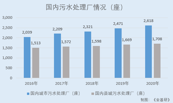 据《2020年城乡建设统计年鉴》数据,2016年-2020年,国内城市污水处理厂数量分别为2,039座、2,209座、2,321座、2,471座、2,618座;国内县城污水处理厂数量分别为1,513座、1,572座、1,598座、1,669座、1,708座。
