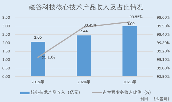 据招股书,2019-2021年,磁谷科技核心技术产品贡献收入分别为2.06亿元、2.44亿元、3.00亿元,占各期主营业务收入的比例分别为99.13%、99.49%、99.55%。