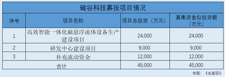 此番上市,磁谷科技拟募集4.5亿元分别投入“高效智能一体化磁悬浮流体设备生产建设项目”、“研发中心建设项目”、“补充流动资金”。 募集资金投资项目系磁谷科技结合自身现有主营业务、生产经营规模、财务状况、技术条件、管理能力、发展目标合理确定。