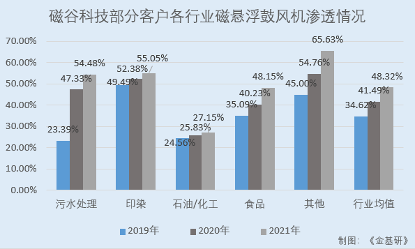 2019-2021年,磁谷科技上述各行业部分客户磁悬浮鼓风机的保有数量占比均值分别为34.62%、41.49%、48.32%。