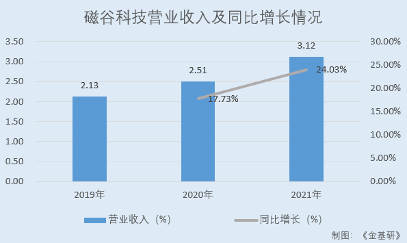 据招股书,2019-2021年,磁谷科技的营业收入分别为2.13亿元、2.51亿元、3.12亿元,2020-2021年分别同比增长17.73%、24.03%。