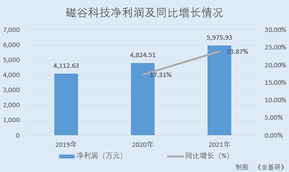 同期,磁谷科技的净利润分别为4,112.63万元、4,824.51万元、5,975.93万元,2020-2021年分别同比增长17.31%、23.87%。