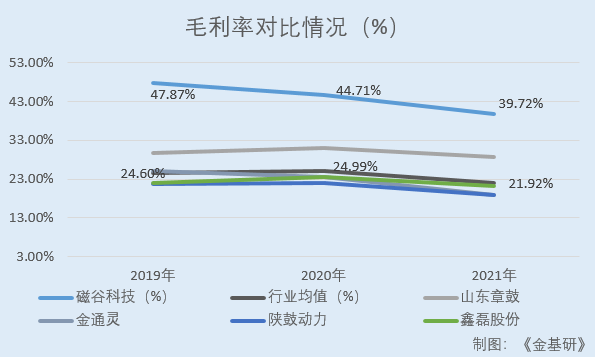 据招股书,2019-2021年,磁谷科技的毛利率分别为47.87%、44.71%、39.72%。