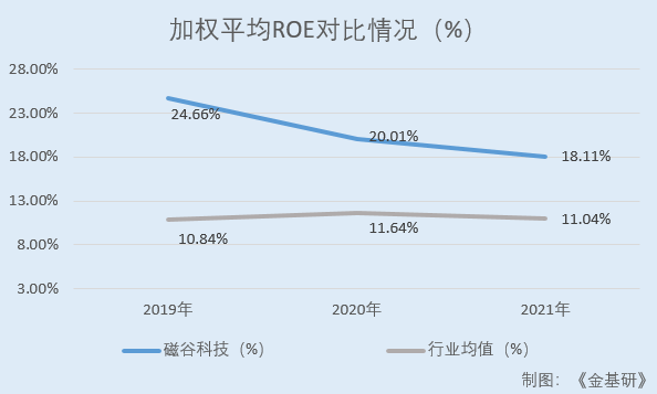 经《金基研》计算,2019-2021年,磁谷科技的四家同行业可比公司加权均ROE均值分别为10.84%、11.64%、11.04%。