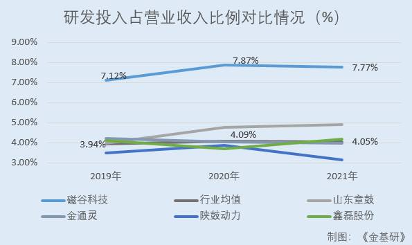 据招股书,2019-2021年,磁谷科技研发投入分别为1,519.04万元、1,977.99万元、2,422.59万元,研发投入占当期营业收入的比重分别为7.12%、7.87%、7.77%。