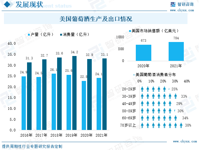 美国为全球最大的葡萄酒消费地。从2016-2021年期间来看,消费量保持在30亿升以上,除2020年受疫情影响有所下滑外,其余年份均保持正增长。2021年消费量为33.1亿升,较上年增加了0.2亿升,销售额为784亿美元,同比增长16.5%。美国葡萄酒消费群体较广,20-29岁消费者更倾向于饮用烈酒,饮用葡萄酒占比仅为25%,但随着年龄的增大,消费者更愿意饮用葡萄酒。